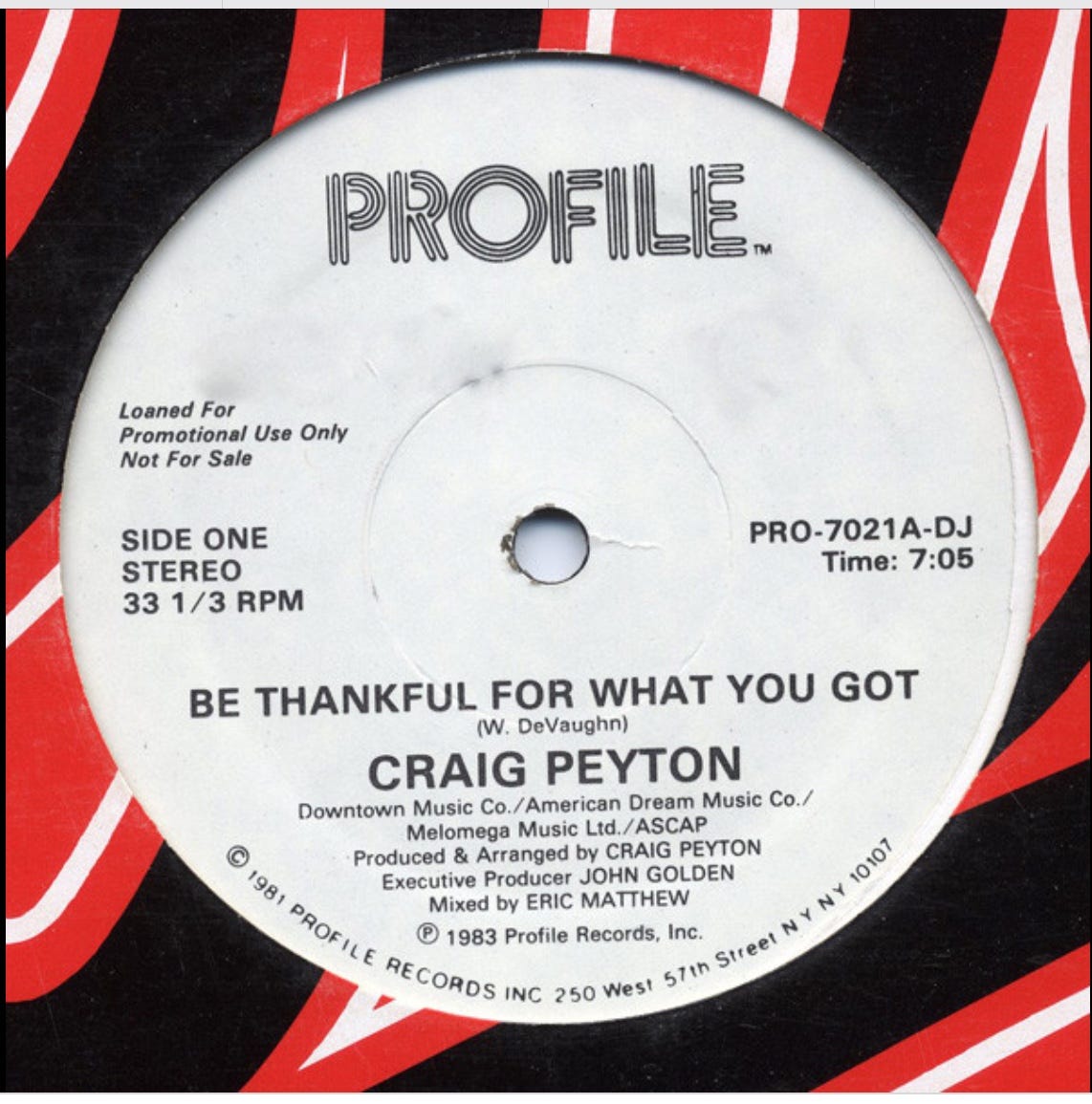 As Craig tells it, he was in a Jamaican hotel room at some point during this particular moment in his career, proper zooted and watching the weather report, allowing the echo machines the TV station had mic’d to the forecaster (yes, this is how they do the weather report there) wash over him. And somewhere amid that ambient buzz, Craig started wondering what it might sound like if one were to take one of his busier, more aggressive fusion baselines and apply them to dance music. He’d been a longtime fan of William DeVaughn’s hit from a decade prior “Be Thankful for What You Got” and what DeVaughn was able to accomplish with the simplicity of a two-minor-chord construction. “Why cover not that?” he thought. And so, upon his return to NYC, Craig booked some time at a Time Square studio and let rip. The resulting cover, first released by Profile Records in 1983 and presented on digital streaming services for the first time today by ULYSSA, is a haunting and hypnotic krautfunk coup. Whereas DeVaughn’s original was readymade for the slow, Golden Hour cruise through your neighborhood, Craig’s is speedy and sharp. It seems to find a moment of beauty while also battening the hatches for the pinstriped Gordon Gekkos and Alex P. Keatons lurking just around the corner. Craig calls his fusion of, well, Fusion baselines and dance music “insidious.” We poopoo that notion. We might suggest that Craig’s “Be Thankful…”, along with some of the more celebrated songs from that very same year, was rather influential.